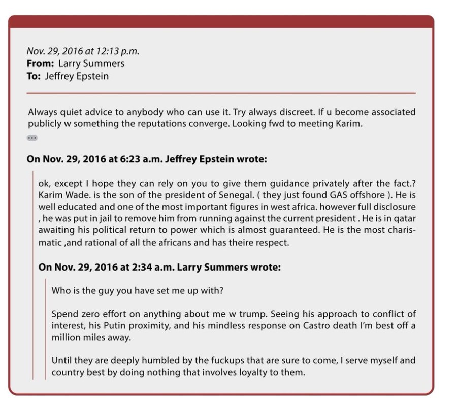 Jeffrey Epstein a présente Karim Wade au très influent Larry Summers, ancien président de Harvard et ancien Secrétaire du Trésor américain. Wade-fils est décrit comme l’un des Africains les plus charismatiques, exilé au Qatar pour ses ambitions présidentielles et dont le retour au sommet du pouvoir est « quasiment assuré ». Notre pétrole est « banalement » cité. Summers était certainement censé l’aider à revenir au Sénégal pour devenir président.