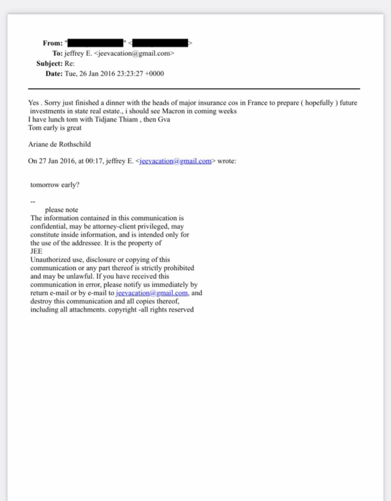 In a January 2016 email to Epstein from Ariane de Rothschild told: « Sorry just finished a dinner with the heads of major insurance cos in France to prepare (hopefully) future investments in state real estate., i should see Macron in coming weeks ».