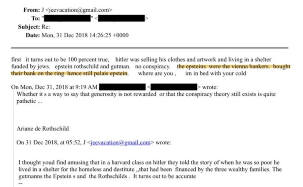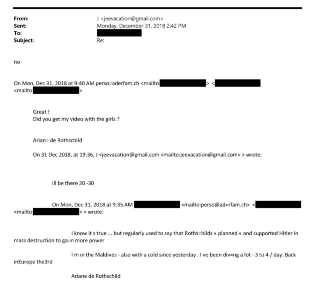 Ariane de Rothschild (French banker, CEO of Edmond de Rothschild) confided to Epstein that her family supported and planned Hitler’s policy of mass destruction to increase their absolute power.