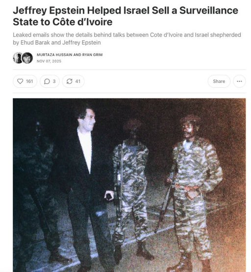 Jeffrey Epstein officially worked for the Israeli government. Leaked emails show Epstein arranged talks between the Israel and Cote d‘Ivoire that culminated in the signing of a formal defence agreement in 2014. Epstein laid the groundwork for a deal that helped flood Cote d’Ivoire with Israeli surveillance tech.