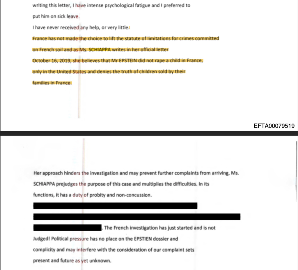 Ce n’est pourtant pas ce que dit la perquisition du 19 septembre 2019. En sachant que Marlène Schiappa dans sa lettre DISCULPE Epstein unilatéralement ! Alors qu’il s’agit d’un criminel notoire. Elle le disculpe aussi facilement sans véritable enquête judiciaire alors qu’il faut toute une procédure interminable complexe INVERSE pour INCULPER quelqu’un ! C’est profondément problématique et complice en réalité.