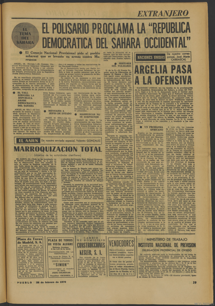 La proclamación de la RASD relatada por el diario PUEBLO del 27 de Febrero de 1976