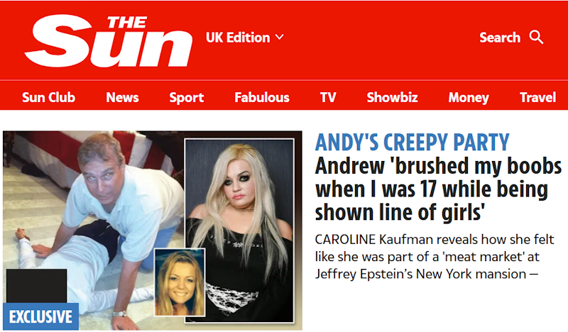 Une américaine âgée aujourd’hui de 32 ans a accusé le prince Andrew de lui avoir effleuré la poitrine alors qu’elle était âgée de seulement 17 ans, lors d’une « soirée macabre » organisée chez le financier pédophile Jeffrey Epstein. La jeune fille faisait partie d’une « ligne de filles » présentées au prince.