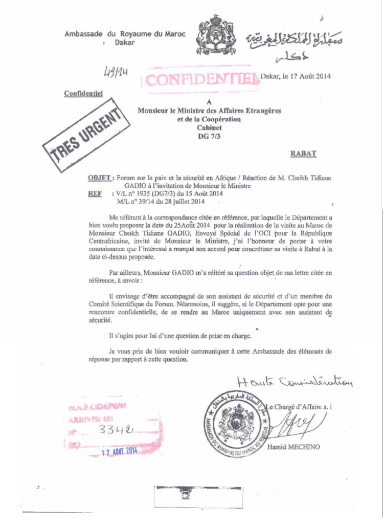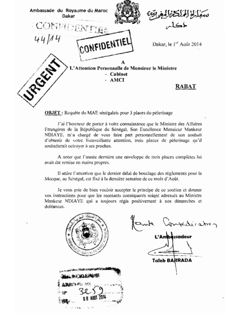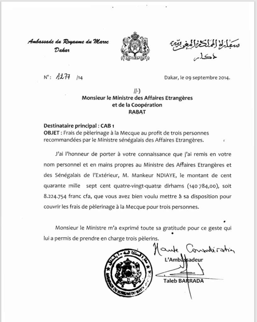 Le document, daté du 9 septembre 2014 et signé par l’ambassadeur du Maroc au Sénégal, Taleb Berrada, évoque explicitement la remise d’un montant de 140 784 dirhams (environ 12 500 euros). Cette somme aurait servi à financer un pèlerinage à La Mecque pour trois personnes désignées par le ministère sénégalais des Affaires étrangères. Le courrier précise que la somme a été remise « en mains propres » et mentionne la gratitude exprimée par le ministre sénégalais.