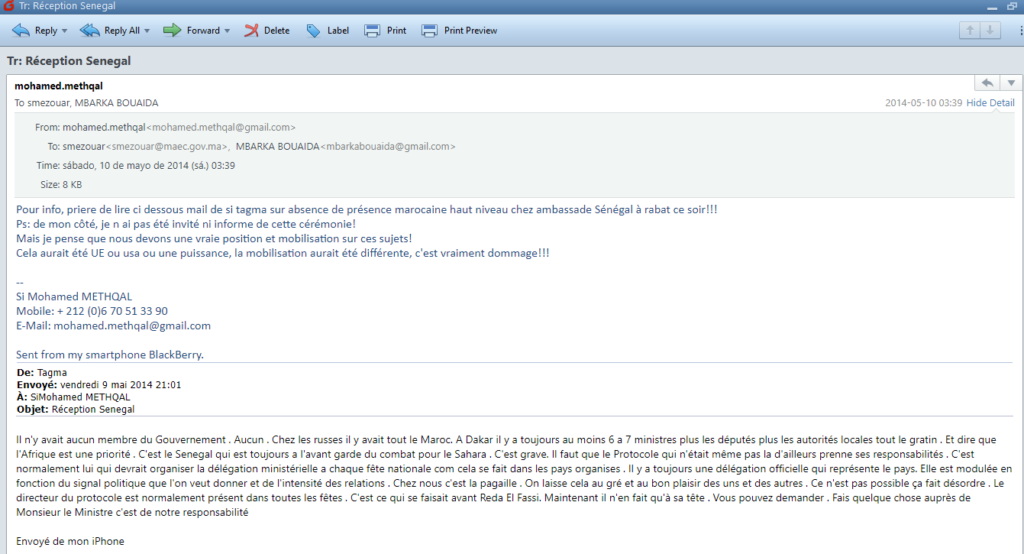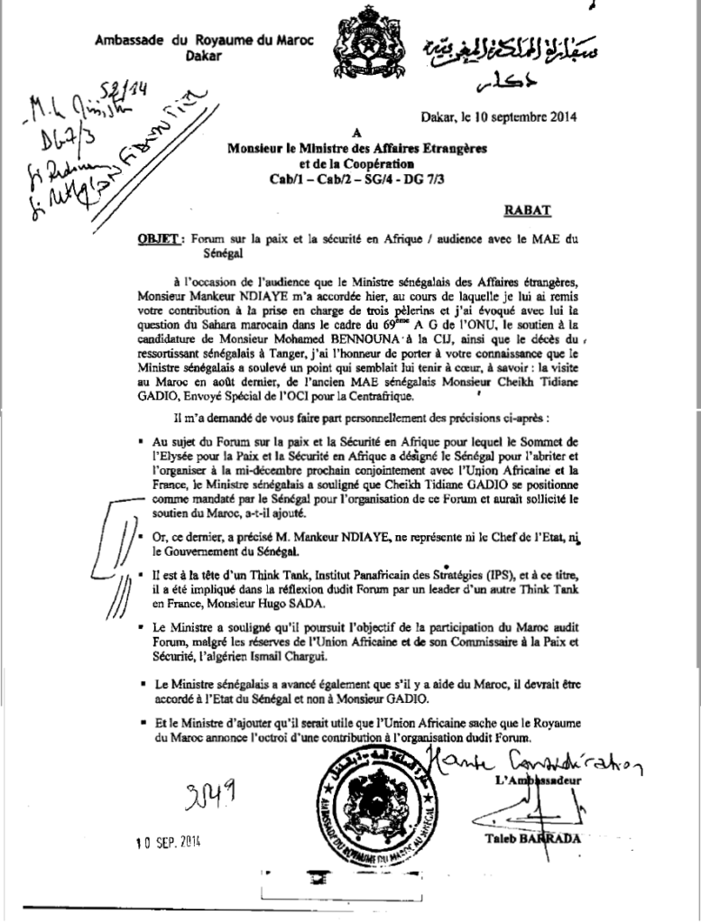Le plus drôle dans cette affaire est que le Sénégal est considéré depuis longtemps comme le terrain privilégié des lobbistes marocains notamment dans les activités visant l’Union Africaine et le Sahara Occidental. En 2014, un conflit entre la DGED et la DGSE a poussé cette dernière à publier des milliers de documents confidentiels de la diplomatie marocaine. Parmi ces documents, des lettres de l’amabassadeur du Maroc au Sénégal, à l’époque, Taleb Berrada, adressées à sa centrale à Rabat.