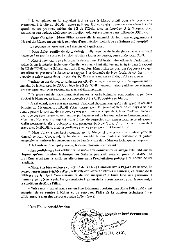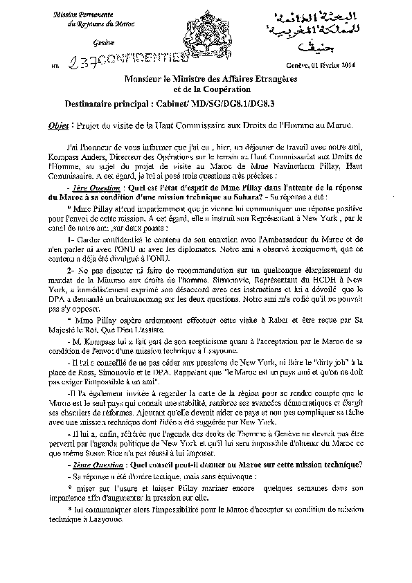Cabe recordad que Kompass también está acusado de transmitir información confidencial sobre el Sáhara Occidental al ex embajador de Marruecos en Ginebra, Omar Hilale. « Yo soy un funcionario de sexo masculino, no pueden acusarme de acoso a una colega y de haber malversado el dinero », dijo, como si quisiera ocultar sus relaciones dudosas con el diplomático marroquí que actualmente ejerce de representante de su país ante la ONU.