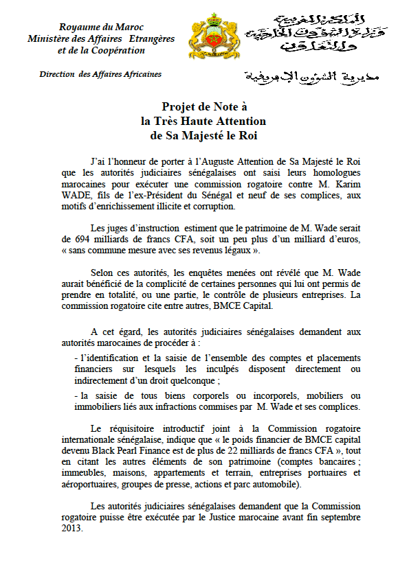 J’ai l’honneur de porter à l’Auguste Attention de Sa Majesté le Roi que les autorités judiciaires sénégalaises ont saisi leurs homologues marocaines pour exécuter une commission rogatoire contre M. Karim WADE, fils de l’ex-Président du Sénégal et neuf de ses complices, aux motifs d’enrichissement illicite et corruption.